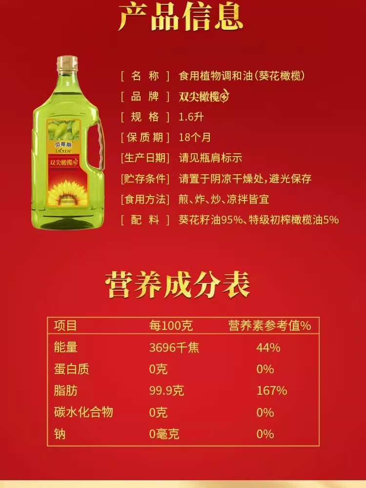 代发贝蒂斯(BETIS)葵花籽橄榄调和油1.6L/瓶