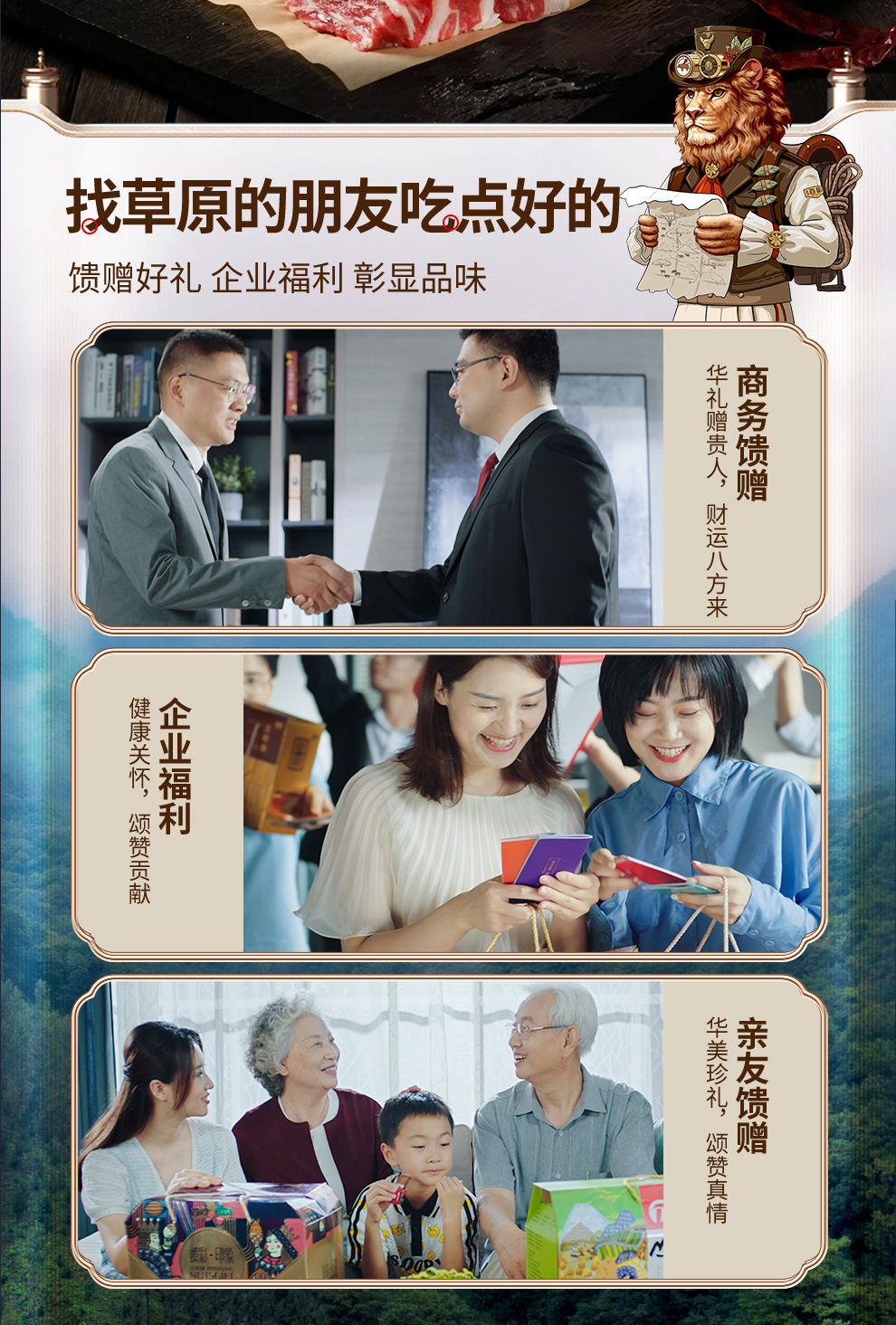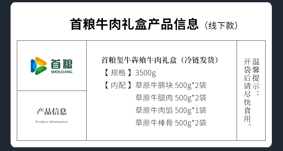 探索草原的味觉奇迹,品尝纯正的自然风味。我们的牛肉礼盒是肉食爱好者的梦想成真,包括:浓郁多汁的草原牛腩块(500g2袋),每一口都是对味蕾的犒赏;结实的草原牛棒骨(500g2袋),炖煮后满溢的香气让人回味无穷;精选的草原牛腿肉(500g2袋),口感结实且富含营养,无论烹饪方式如何,都能保持肉质的鲜嫩;以及细腻的草原牛肉馅(500g2袋),无论是包饺子还是做肉酱,都能让您的菜肴更上一层楼。这个礼盒是对品质生活的承诺,也是对家人的爱的表达。