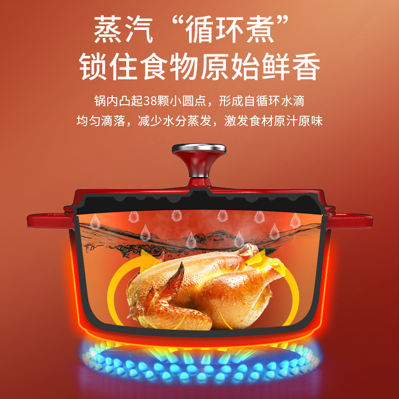 【型号】S16。【规格】产品尺寸(长x宽x高):约280x220x150mm;产品重量:3.85kg;颜色:红色;产品材质:铸铁(HT150);涂层材质:珐琅釉料;产品容量:2.5L。【功能特点】进口珐琅釉,渐变色设计,超高颜值,不沾污易清洗,冲水即净;珐琅硬度高,耐高温,明火可用,受热均匀,导热更快;锅内凸起38颗小圆点,形成自循环水滴,均匀滴落,减少水分蒸发,激发食材原汁原味;导热快保温能力强,加热后表面会捕获热量使其具有出色的保温性;燃气灶、电磁炉、电丝炉、电陶炉、烤箱等多种炉灶通用,开心烹饪不受限;