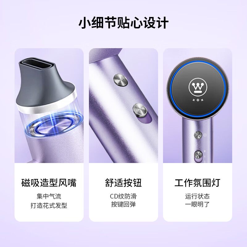 【功能特点】创新无刷电机,1500W大功率;11万转/分钟高速电机,59m/s真实风速,速干无需久等;释放高浓度2亿级负离子,远离静电,养发护发;4档风温调节,2档风速,氛围灯显示,灵活操控;冷热风自动交替循环吹出,防止过热造成不可逆转的“热损伤”;360°可旋转磁吸顺滑风嘴,多种造型轻松驾驭。