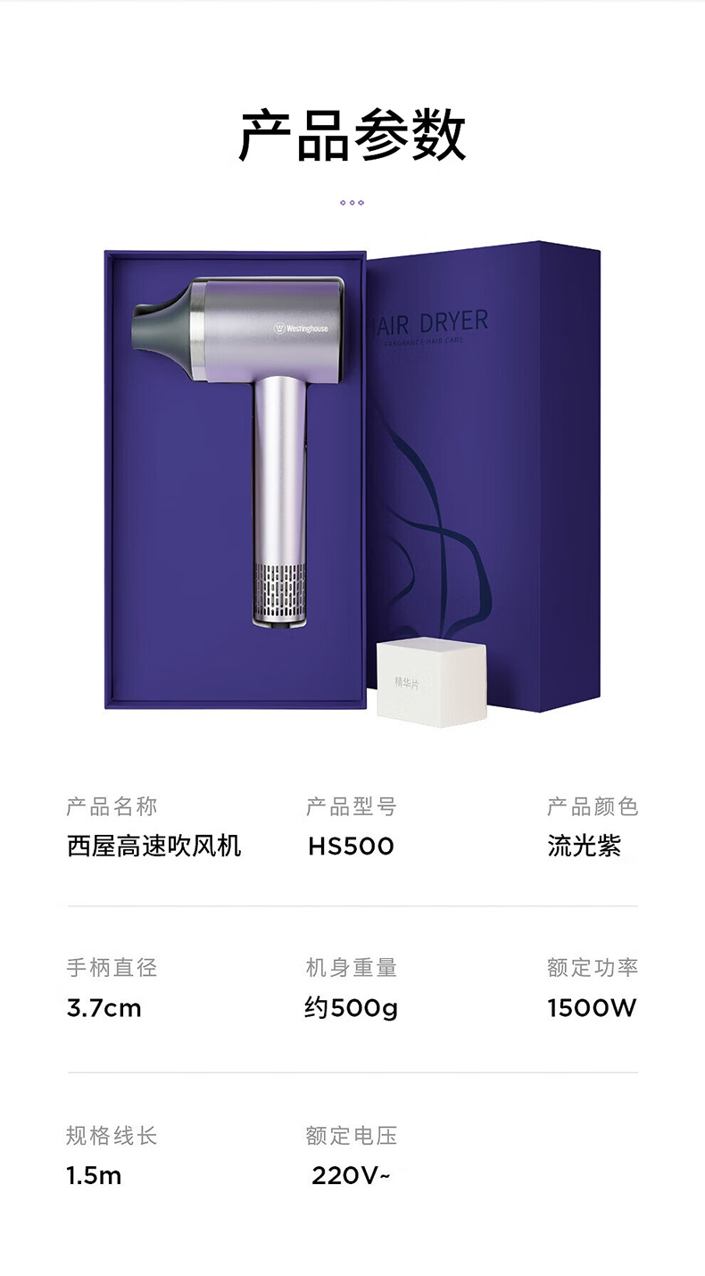 【型号】HS500。【规格】产品尺寸(长x宽x高):288x88x68mm;产品重量:660g;颜色:流光紫;产品材质:铝;额定输入:50Hz;额定电压:220V;额定功率:1500W;档位:2档风速、4档风温;负离子:2亿。