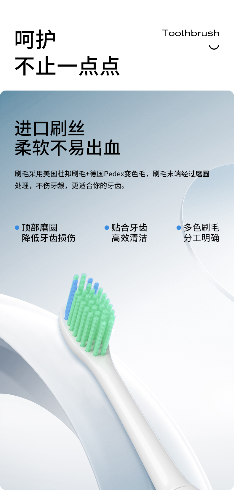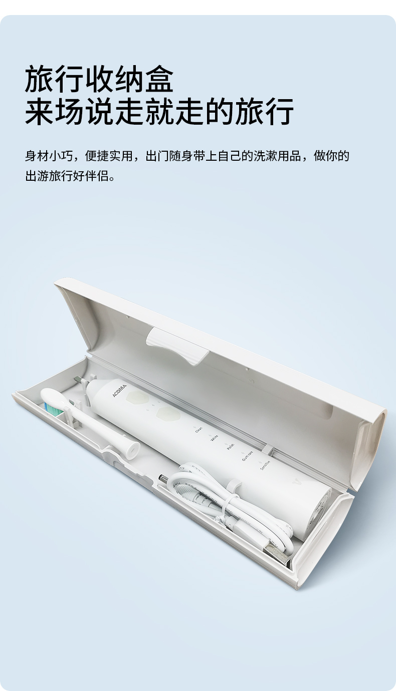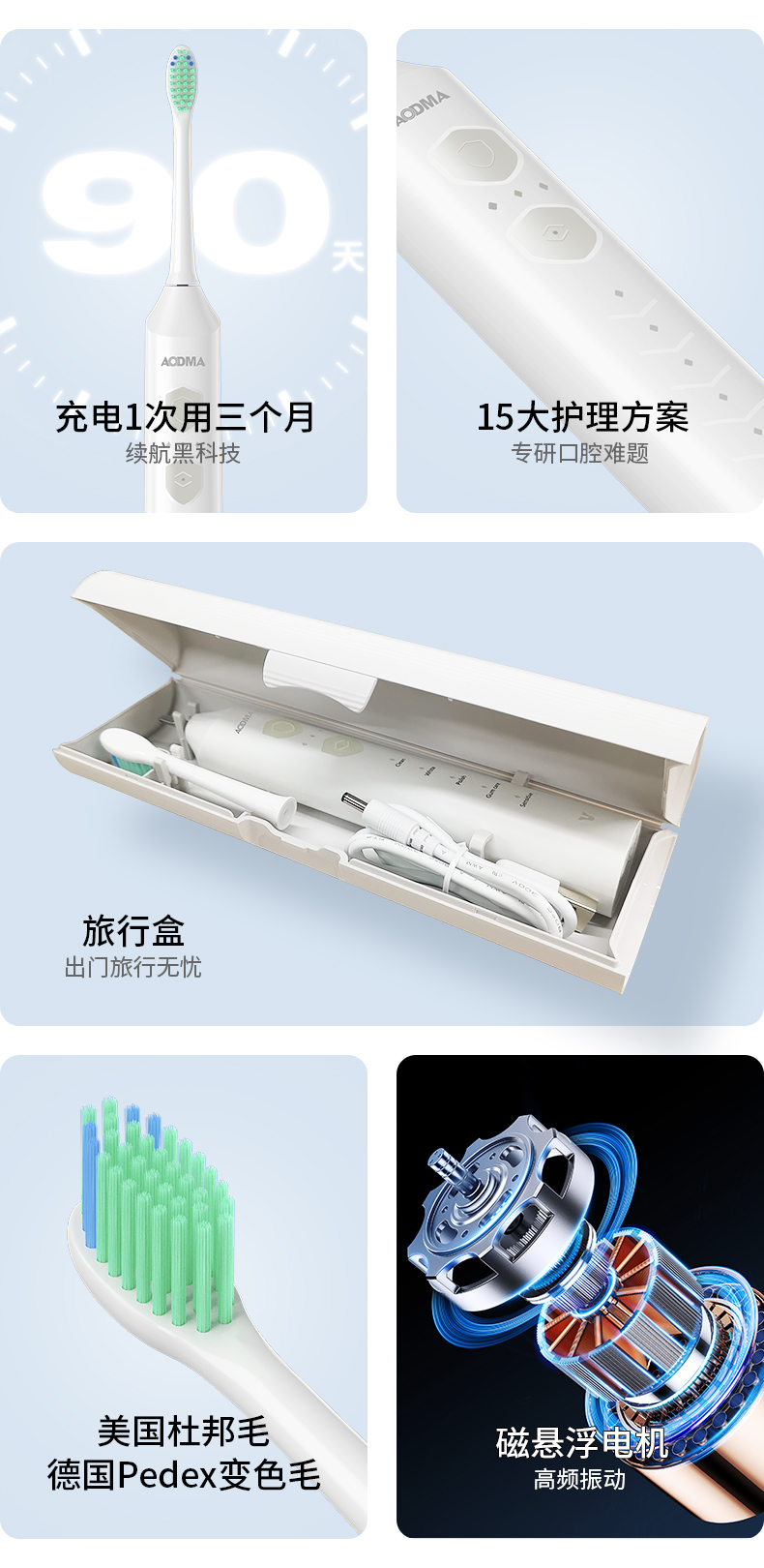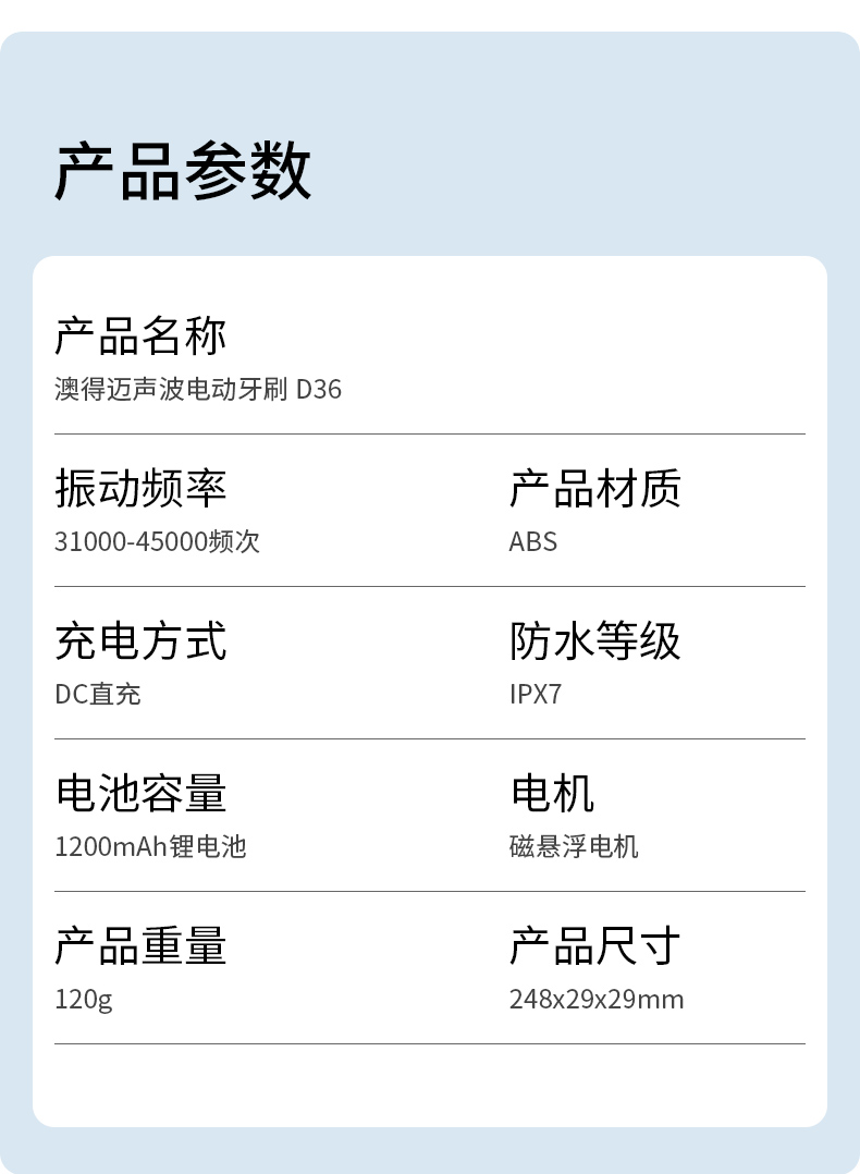 【型号】D36。【规格】产品尺寸(长x宽x高):约248x29x29mm;产品重量:120g;颜色:白色;产品材质:ABS;额定输入:5V⎓2W;振动频率:31000-45000频次;充电方式:DC直充;防水等级:IPX7;电池容量:1200mAh锂电池。【功能特点】刷毛采用美国杜邦毛+德国Pedex变色毛,顶端磨圆处理,不伤牙龈,根据使用时间长短自动变色,提醒更换;5档15模式,每个模式有3个档位,适用于不同口腔类型需求;2分钟自动关机,30秒智能提醒,记忆功能;充电指示灯红灯呼吸闪烁,充满绿灯长亮30秒后熄灭;充满电约4小时,充满电一次可使用三个月左右(注:每天刷牙2次,每次2分钟);专利磁悬浮双核电机,动力更强,洁牙效果更佳;旅行盒,挂架,牙线全配置,随时随地贴心陪伴;