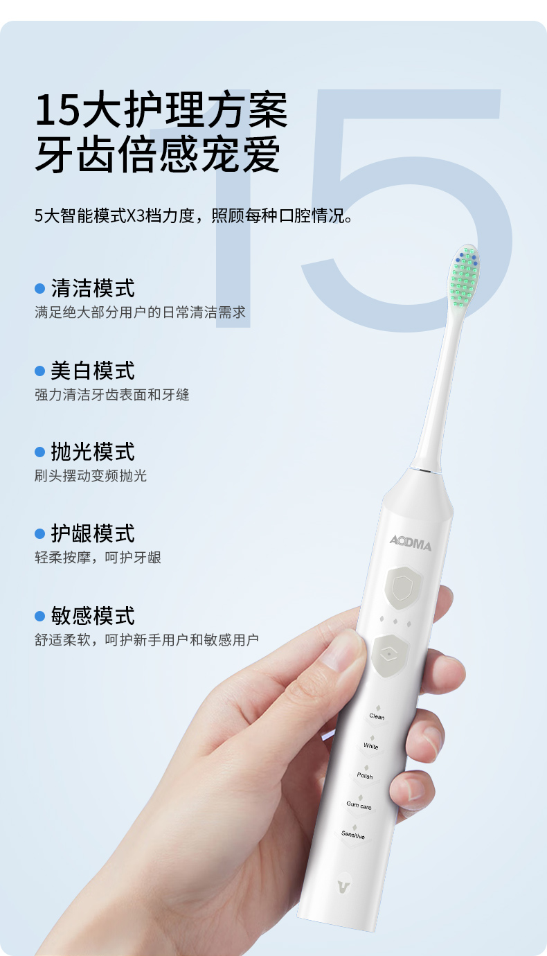 当前位置:首页 > 家用电器 > 个护电器 > 电动牙刷系列 > 澳得迈(AODMA)声波震动电动牙刷成人男女款 磁悬浮电机 5大智能模式 IPX7级防水 D36 白色
