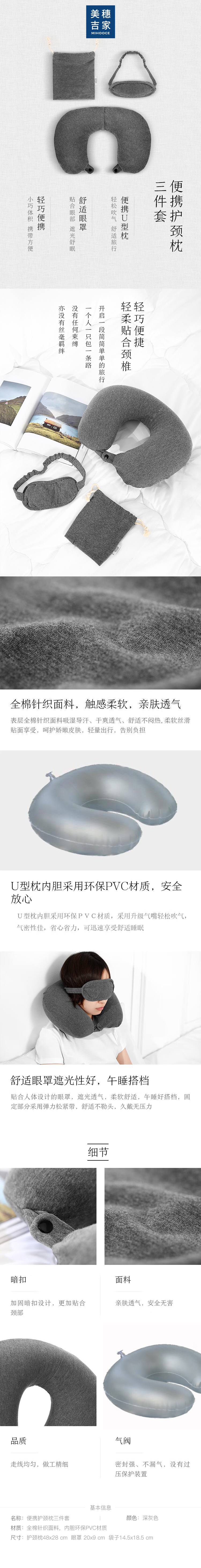 代发美穗吉家 便携旅行充气护颈枕三件套 灰色型号:MIH-2510036