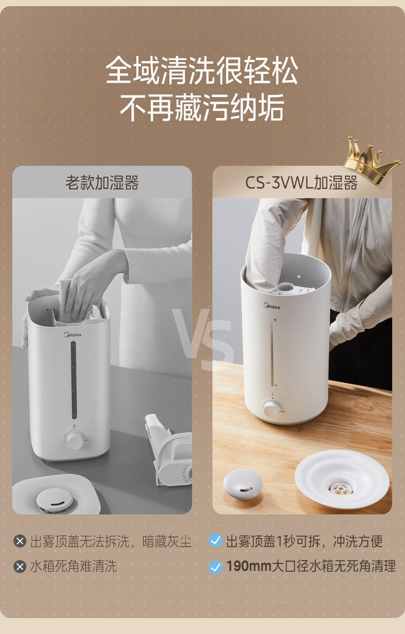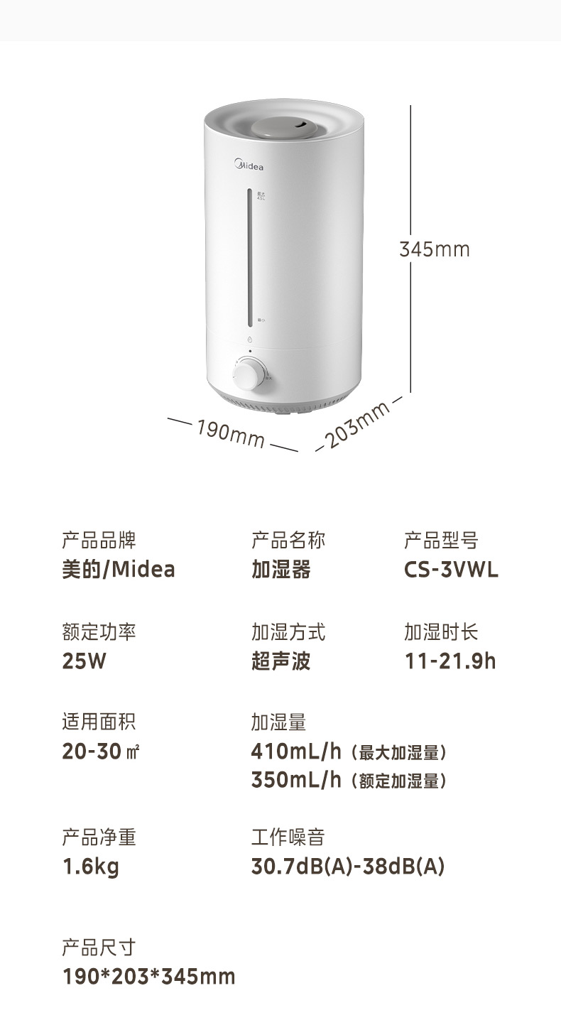 代发美的 家用空气净化器 大容量轻音空气加湿器 办公室桌面加湿器CS-3VWL