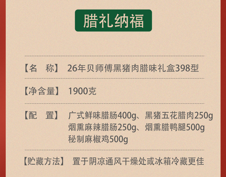 代发26年贝师傅黑猪肉腊味礼盒398型-腊礼纳福1900g