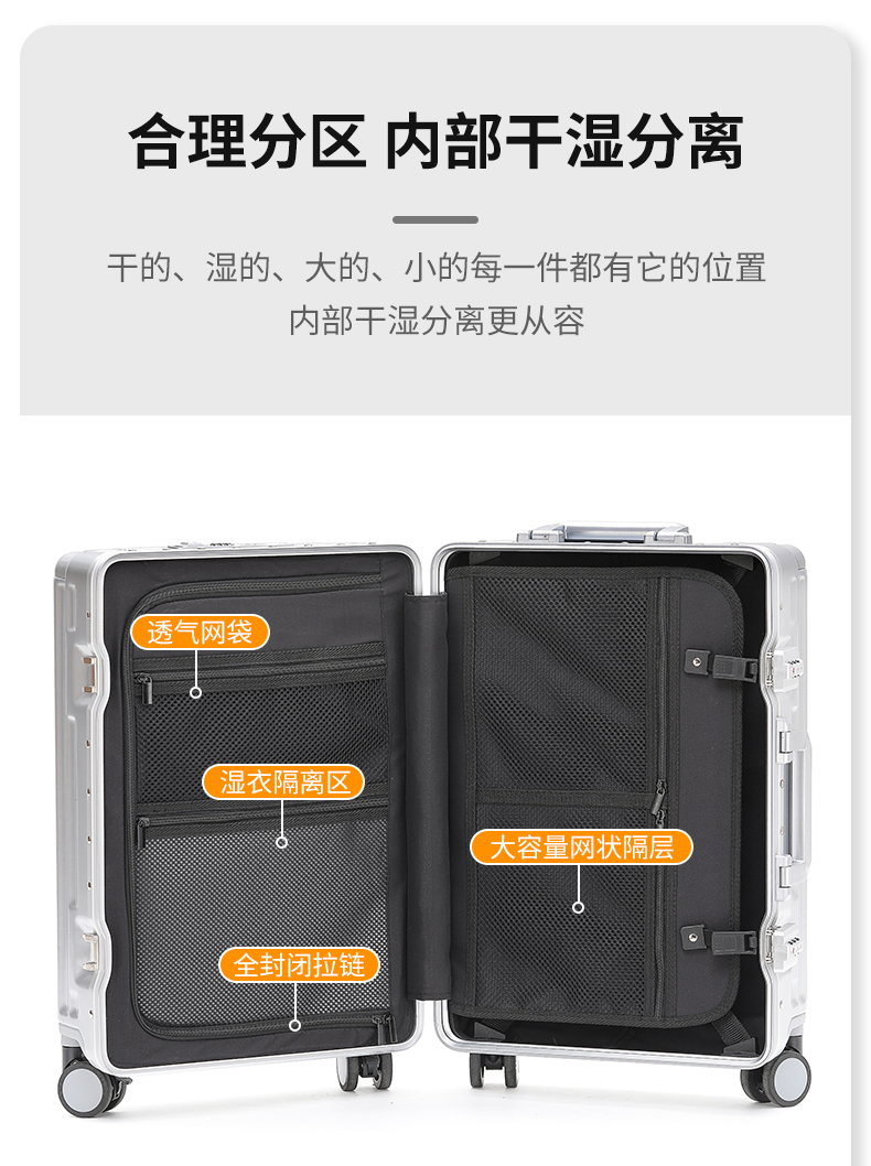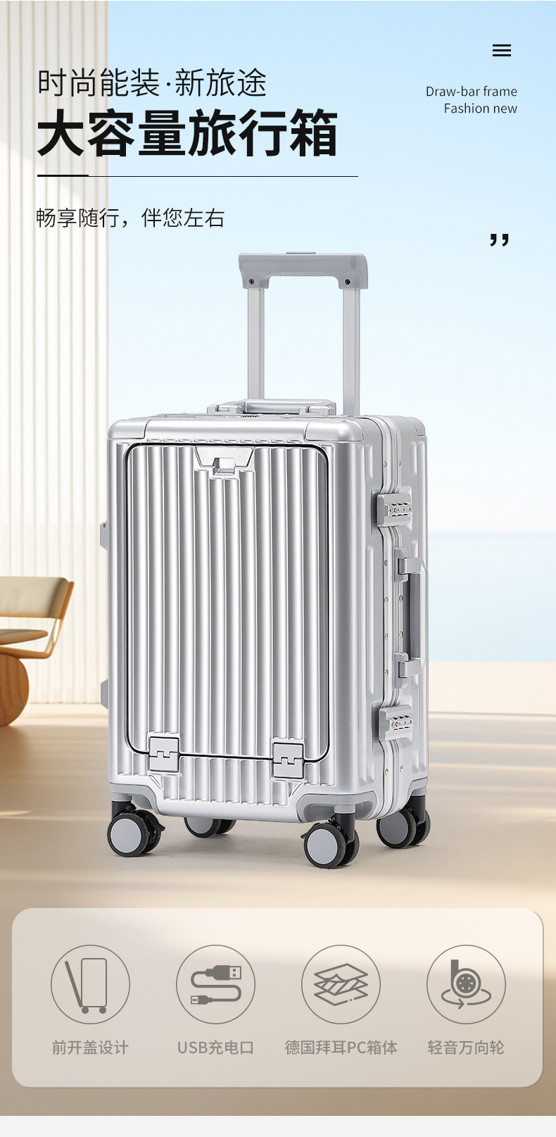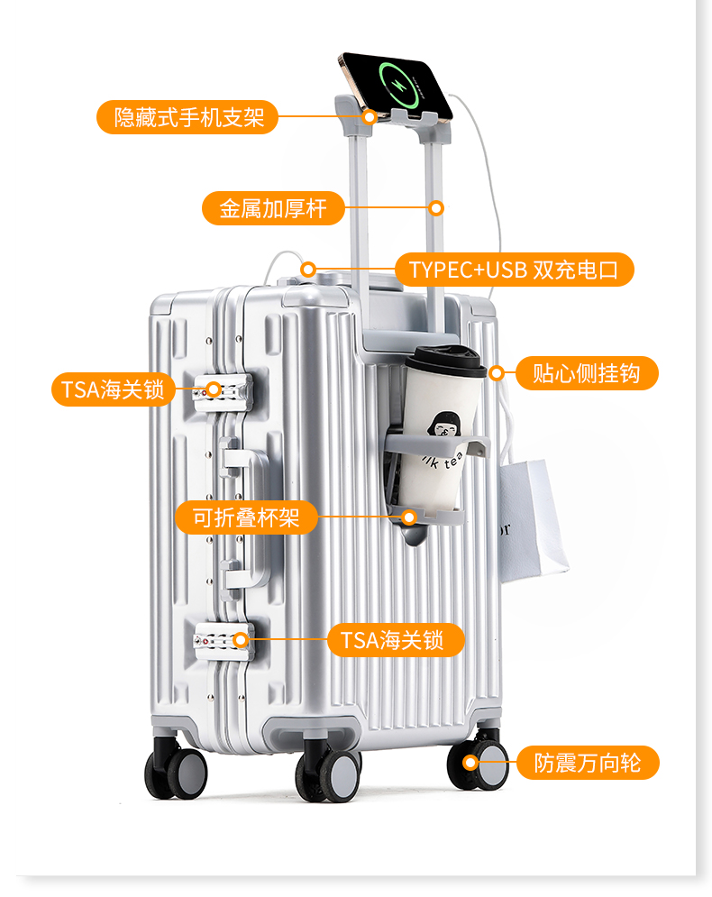 代发途帮TOBOOG 前开口多功能带杯架USB接口铝框箱锁扣密码箱拉杆箱 2311 20寸