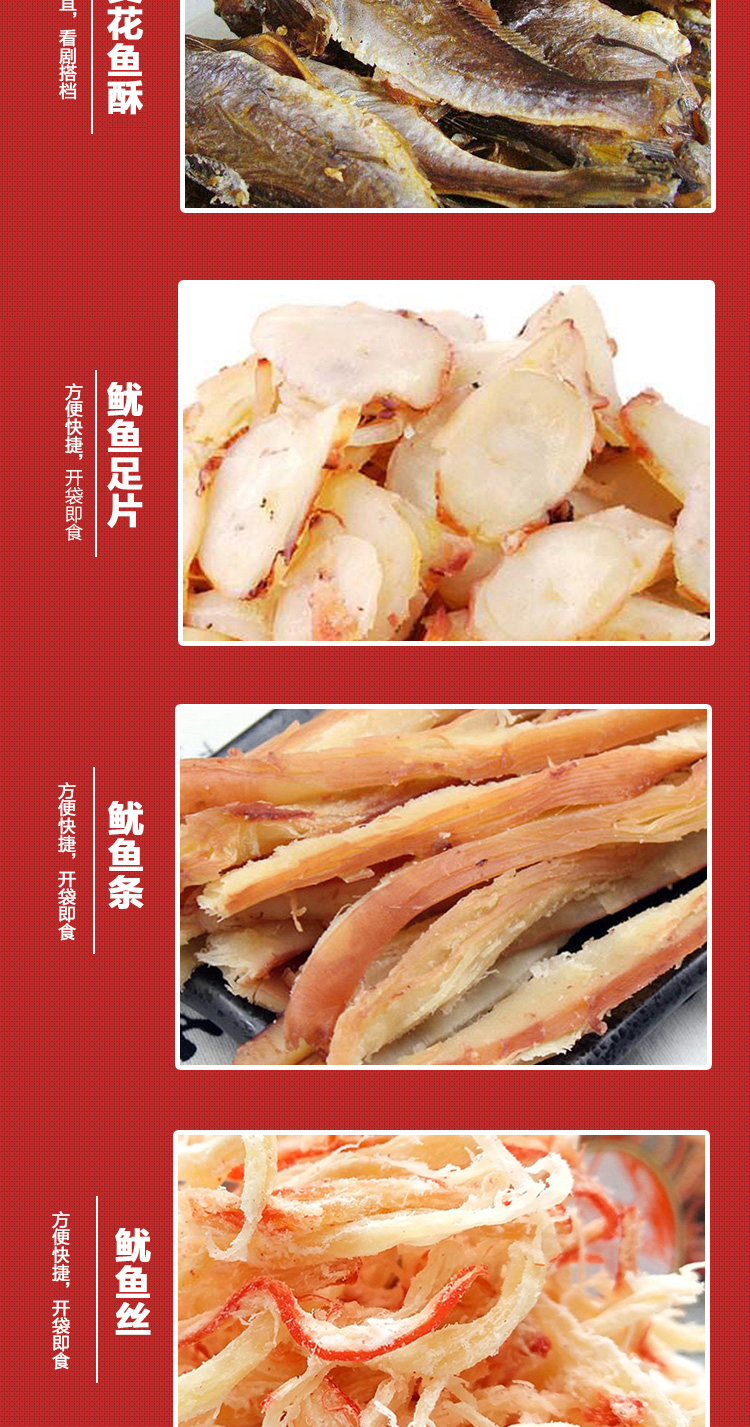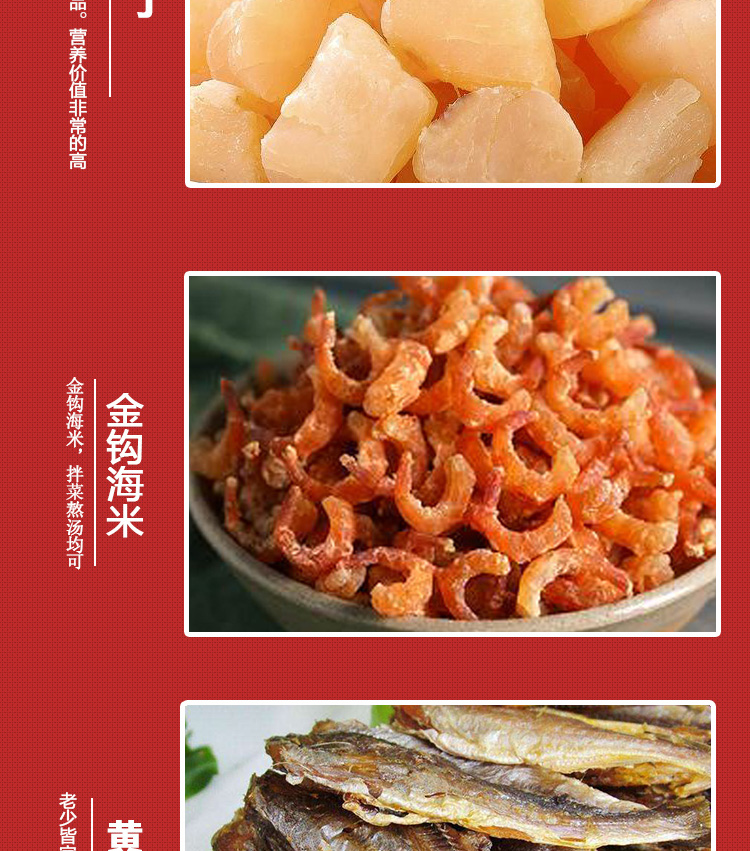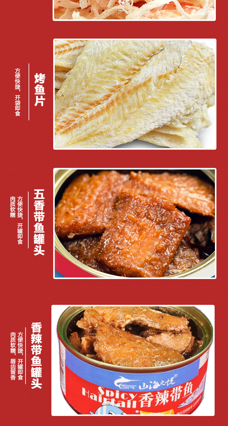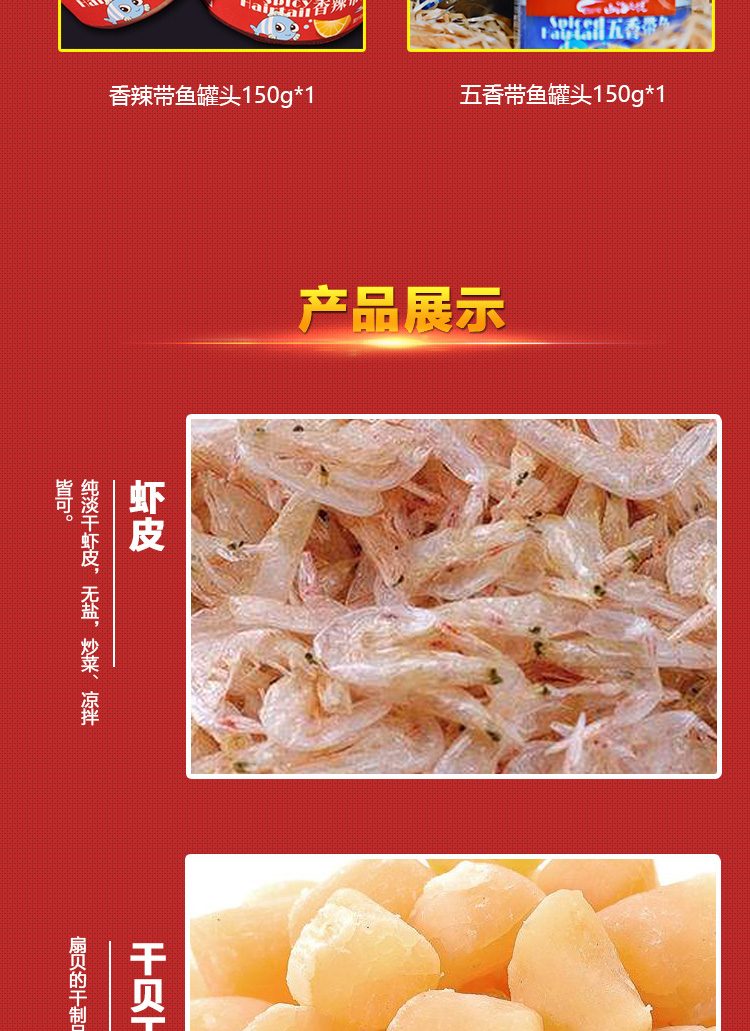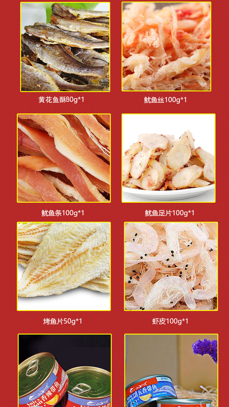 干贝丁100g*1,金钩海米100g*1,虾皮100g*1,鱿鱼足片100g*1,鱿鱼条100g*1,鱿鱼丝100g*1,烤鱼片50g*1,黄花鱼干80g*1,香辣带鱼罐头150g*1,五香带鱼罐头150g*1
