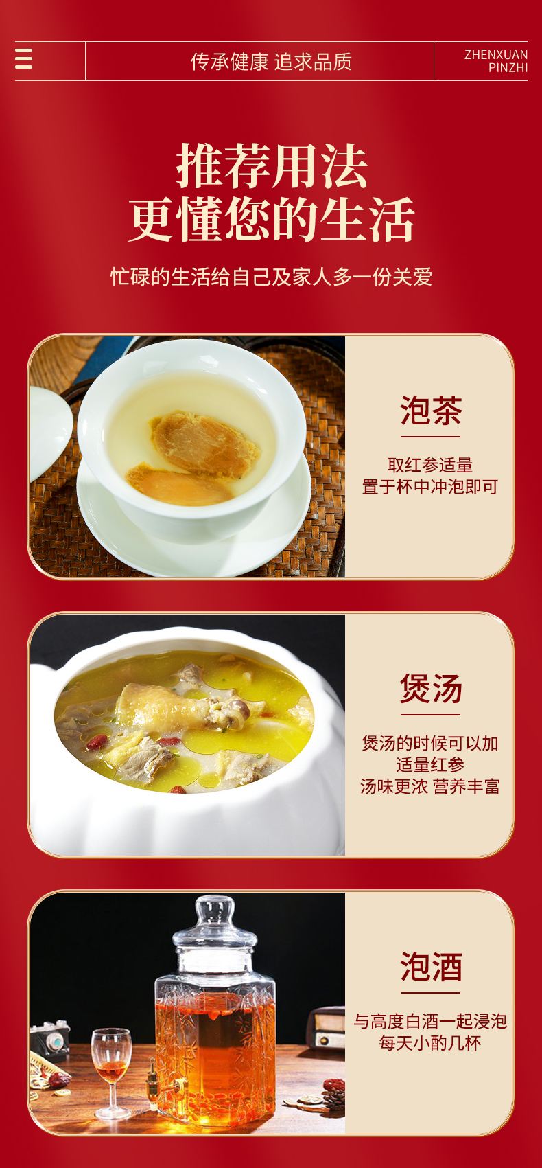 • 道地选材:源自安徽亳州产区,红参品质上乘。