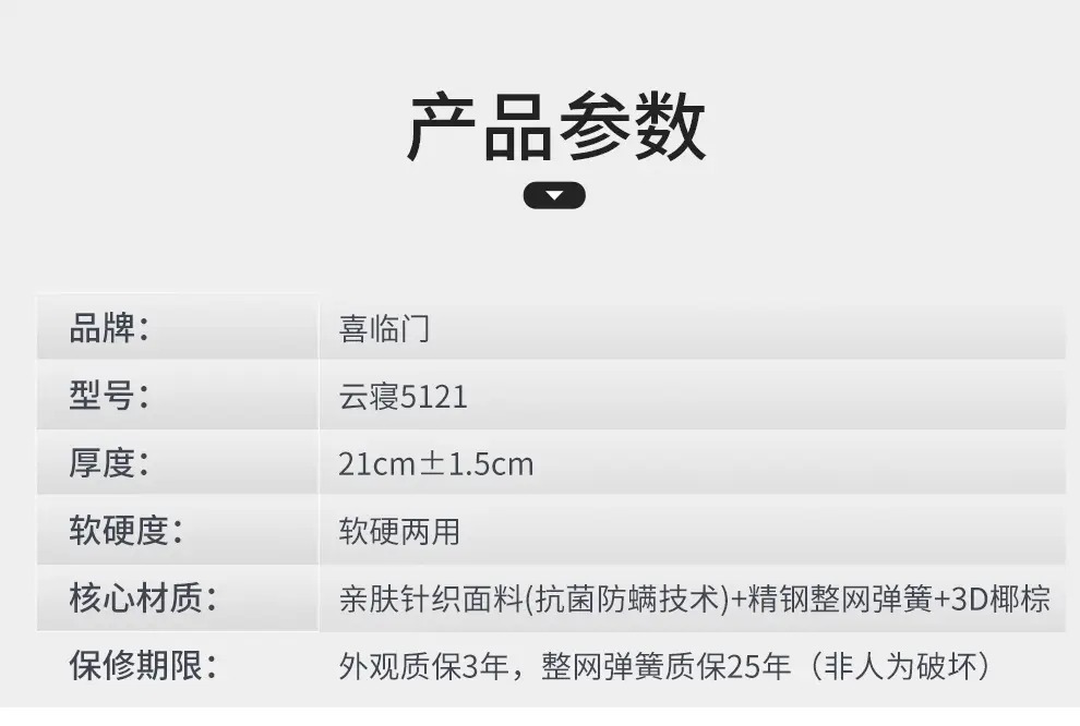 当前位置:首页 > 家纺布艺 > 床上用品 > 床垫 > 喜临门 云寝3D椰棕抗菌防螨强效护脊床垫
